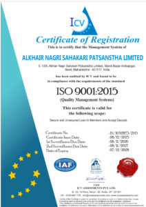 अंबाजोगाई तालुक्यातील सर्वसामान्य माणसाचा विश्वास संपादन केलेल्या अलखैर नागरी पतसंस्थेच्या कार्यामध्ये आयएसओ मानांकन प्राप्त झाले असून हा एक मानाचा तुरा पतसंस्थेच्या यशस्वीतेमध्ये रोखला गेला आहे. आयएसओ मानांकन प्राप्त झाल्याने त्यांची व संचालक मंडळाचे सर्वस्तरांतुन अभिनंदन व कौतुक होत आहे.