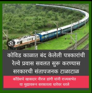 अखिल भारतीय मराठी पत्रकार परिषदेने या मागणीचा रेल्वे मंत्र्यांकडे सातत्यानं पाठपुरावा केला आहे. रावसाहेब दानवे रेल्वे राज्यमंत्री असताना त्यांनाही मराठी पत्रकार परिषदेचं शिष्टमंडळ भेटले होते. खासदारांना देखील पत्रव्यवहार करून लोकसभेत, राज्यसभेत हा प्रश्न उपस्थित करण्याची विनंती केली होती. त्यानुसार यापुर्वी पप्पू यादव, दुराई वैको, वद्दीराजू रवींचंदर्, अमर काळे यांनी संसदेत हा मुद्दा उपस्थित केलेला आहे.. आज पुन्हा नीरज डांगी यांनी पत्रकारांच्या जिव्हाळ्याच्या प्रश्नाकडे सरकारचे लक्ष वेधले. संतापाची गोष्ट अशी की, रेल्वे मंत्र्यांनी यावर ठोस कोणतेच आश्वासन दिलं नाही..