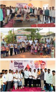 दिपक शिंदे मित्रमंडळाच्या वतीने जि.प. प्राथमिक शाळा श्रीपतरायवाडी येथील शाळेत विद्यार्थ्यांना शालेय साहित्याचे वाटप करण्यात आले. कार्यक्रमाला शाळेचे शिक्षक देशमुख सर, मुख्याध्यापक संगवे सर, ग्रामपंचायत सरपंच गोवर्धन मनोहर पवार, शाळा व्यवस्थापन समितीचे अध्यक्ष पांडुरंग अस्वले यांची प्रमुख उपस्थिती होती.या उपक्रमात भारत माने, विलास माने, गोपाळ पवार, गणेश माने, आशिष हंगे, माऊली माने, अक्षय पवार, अभिषेक बुरशे, ज्ञानेश्वर शिंदे, मनोज माने, रोहित पवार, सागर पवार, गोविंद माने, प्रतीक तारळकर, श्याम माने, सत्यजित शिंदे, विजय हंगे, किरण शिंगारे, अतुल थोरवे, अनंत शिंदे, प्रशांत जाधव, श्रीहरी गुंड,दरम्यान दिपक शिंदे मित्रमंडळ हे जिल्ह्यात सातत्याने सर्वाधिक रक्तदान शिबिरे आयोजित करणारे मंडळ म्हणून ओळखले जाते. दिपक शिंदे हे स्वतःही सामाजिक बांधिलकी जपत स्वाराती रुग्णालयातून किंवा शहरातील कोणत्याही रुग्णाचा फोन आला की रात्री-अपरात्री निस्वार्थपणे मदतीसाठी धावून जातात, अशी माहिती मित्रपरिवाराने दिली.